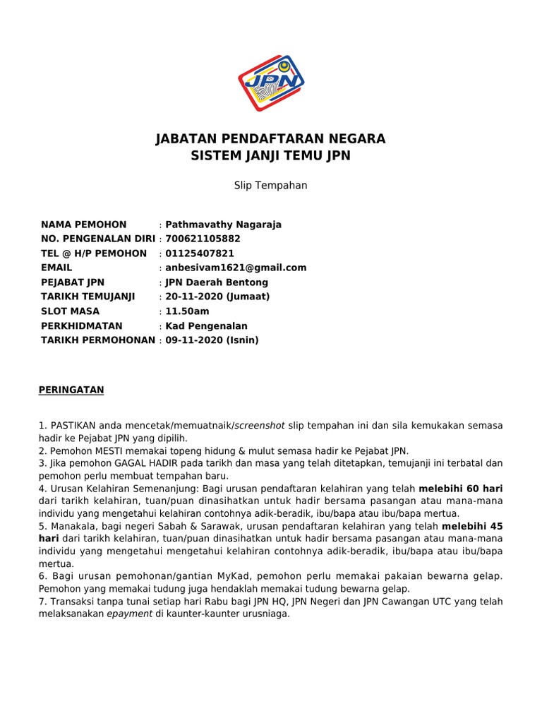 Bagi Urusan Pendaftaran Kelahiran Kematian pelanggan boleh hadir tanpa janji temu di Pejabat JPN yang. It can be reach via phone 609-222 1582 or fax 609-222 2487. Jabatan Pendaftaran Negara JPN Cawangan Bentong National Registration Department.